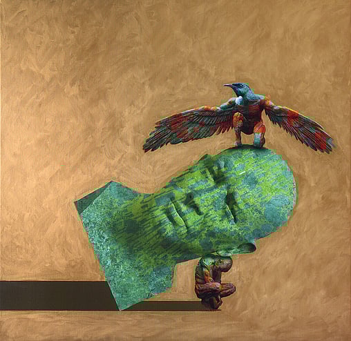My intention with these works is to create a sense of both timelessness and whimsy, by fusing together elements from different cultures and periods in time. The use of gold-leaf paint adds a touch of the opulent and the grandiose, while the starkly isolated anthropomorphic subjects inject a sense of childlike playfulness and humour.