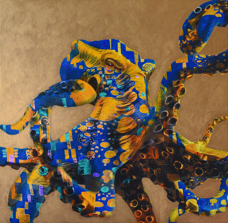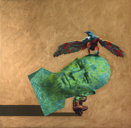 My intention with these works is to create a sense of both timelessness and whimsy, by fusing together elements from different cultures and periods in time. The use of gold-leaf paint adds a touch of the opulent and the grandiose, while the starkly isolated anthropomorphic subjects inject a sense of childlike playfulness and humour.